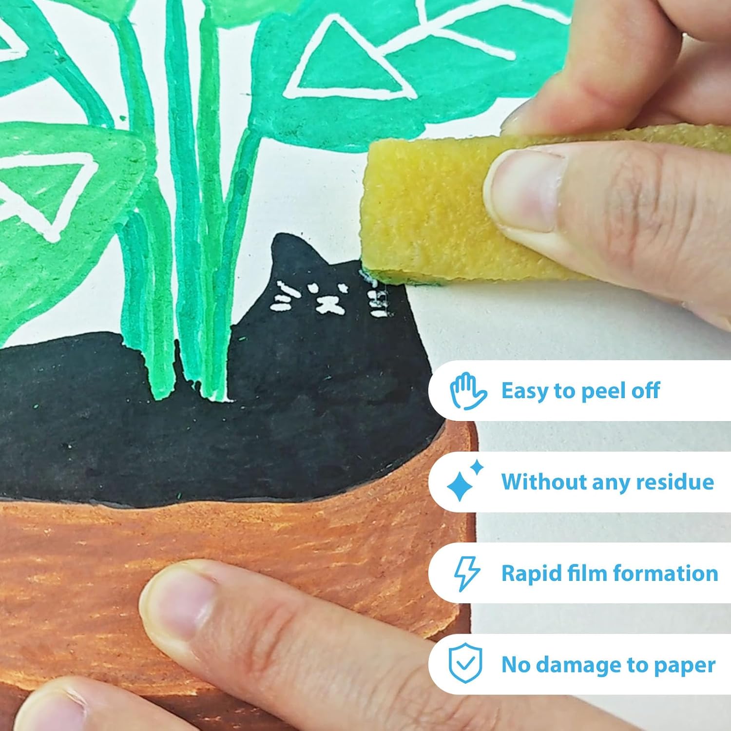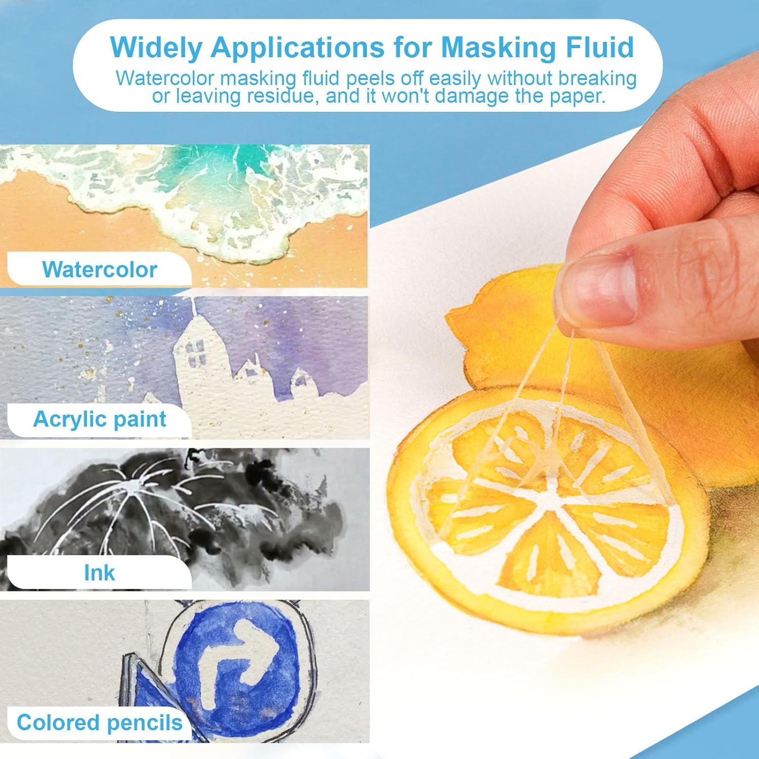 - Easy to Remove: The masking fluid comes with a brush and eraser. Use our brush to easily apply the liquid masking fluid. Once the masking liquid is completely dry, erase it with your finger or an eraser to reveal the clear areas and fine details. Once dry, it peels off easily without breaking or leaving residue, and it won't damage the paper.