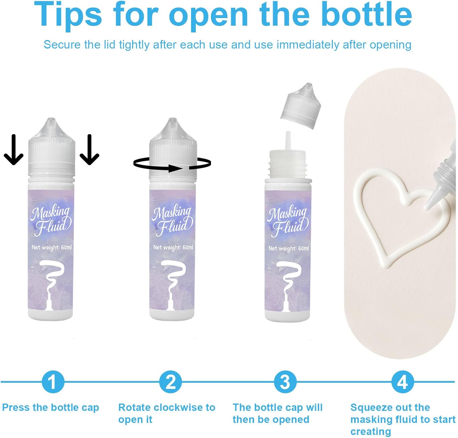 - White, quick-drying formula: Our watercolor masking fluid is white and uses a quick-drying formula that has a slight tint when applied, making it easy to control the application area. It sets quickly after application, reducing your waiting time.