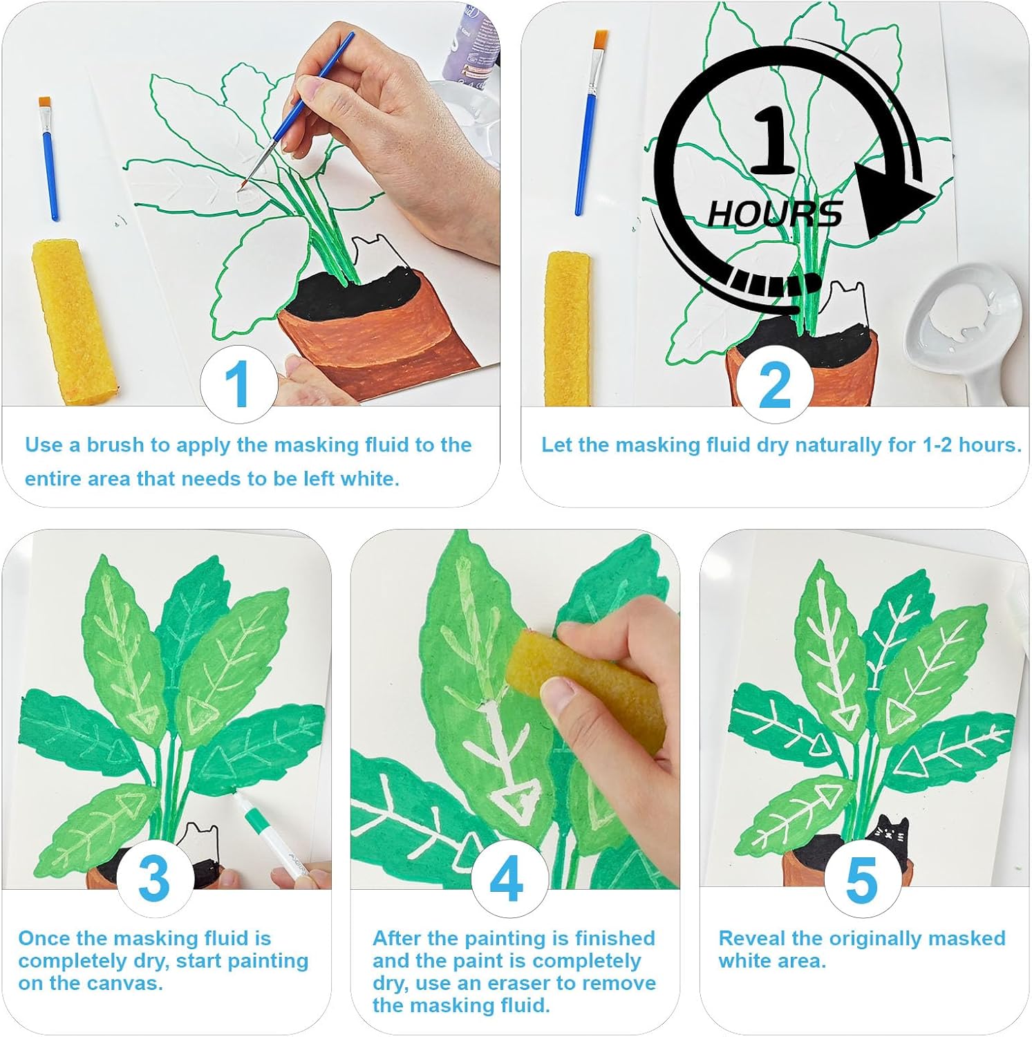 - Easy to Remove: The masking fluid comes with a brush and eraser. Use our brush to easily apply the liquid masking fluid. Once the masking liquid is completely dry, erase it with your finger or an eraser to reveal the clear areas and fine details. Once dry, it peels off easily without breaking or leaving residue, and it won't damage the paper.